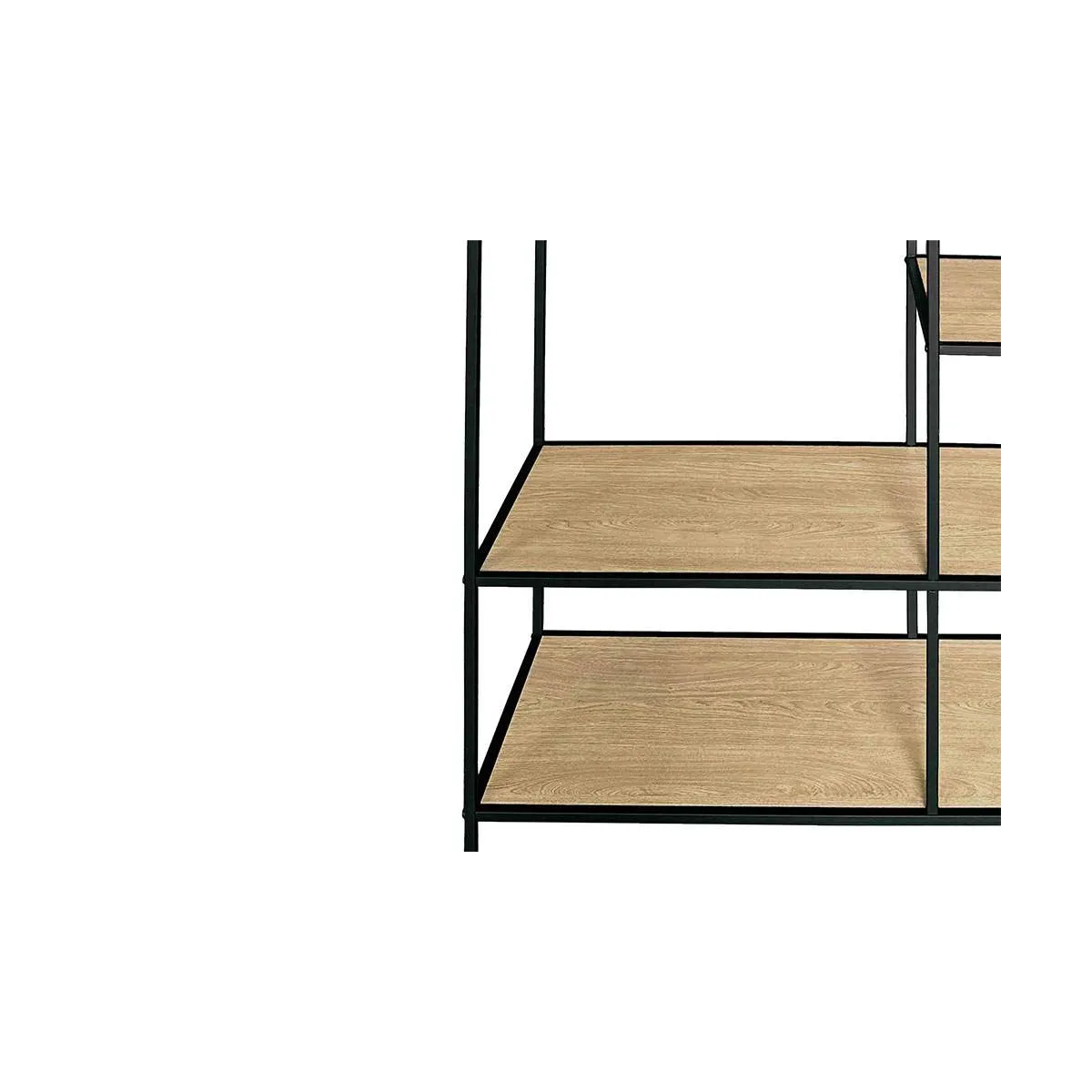 La mesa de escritorio con estantería Seaford, de 5 huecos, acabada en dos versiones de color: lacado negro y tablero laminado en color Roble y lacado negro y tablero laminado en color negro, es perfecta para espacios reducidos y sus líneas sencillas que recuerdan a un estilo nórdico muy acentuado, darán a tu estancia una funcionalidad y una calidez propia...