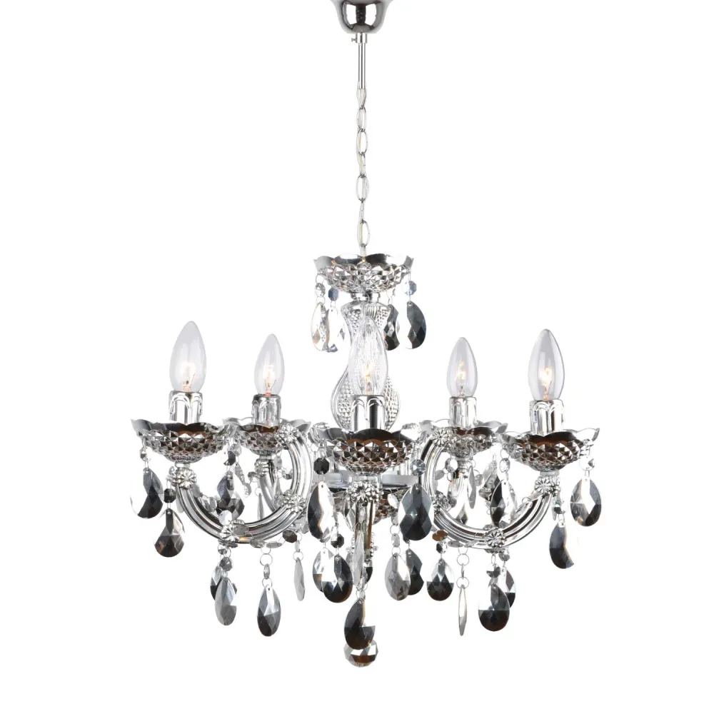 Lámpara de techo Magalí fabricada en acrílico transparente y acero cromado. Consta de 5 puntos de luz y funciona con 5 bombillas de casquillo E-14 para un máximo de 40W (no incluidas)