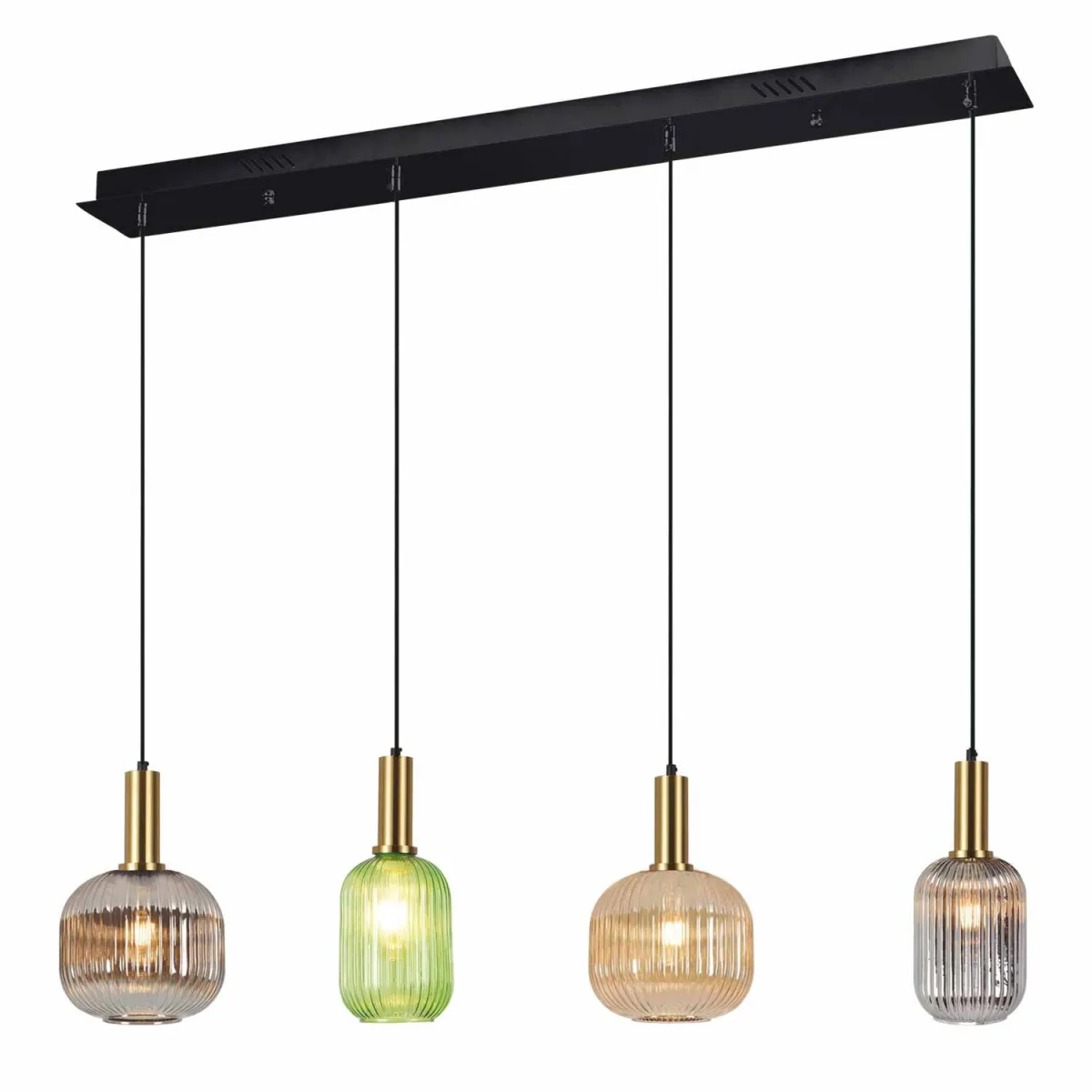 La Lámpara de Techo 5 Luces Glory se caracteriza por su diseño exclusivo con dos tulipas verdes, dos ámbar y una fumé, cada una con una forma distinta. Con una estructura de acero pintado en oro, esta lámpara es perfecta para ambientes modernos y sofisticados.