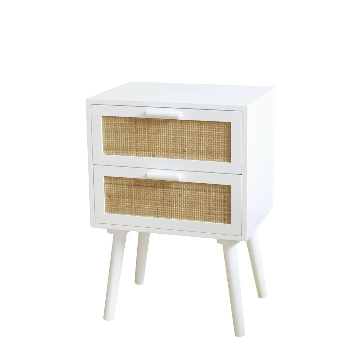 Ce magnifique bureau-console Tesva en blanc, est réalisé en frêne en finition blanche, avec des pieds en pin en finition blanche et en rotin naturel.