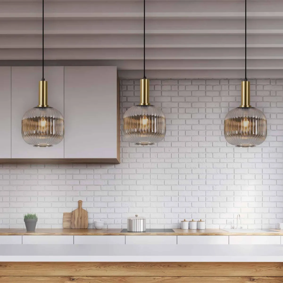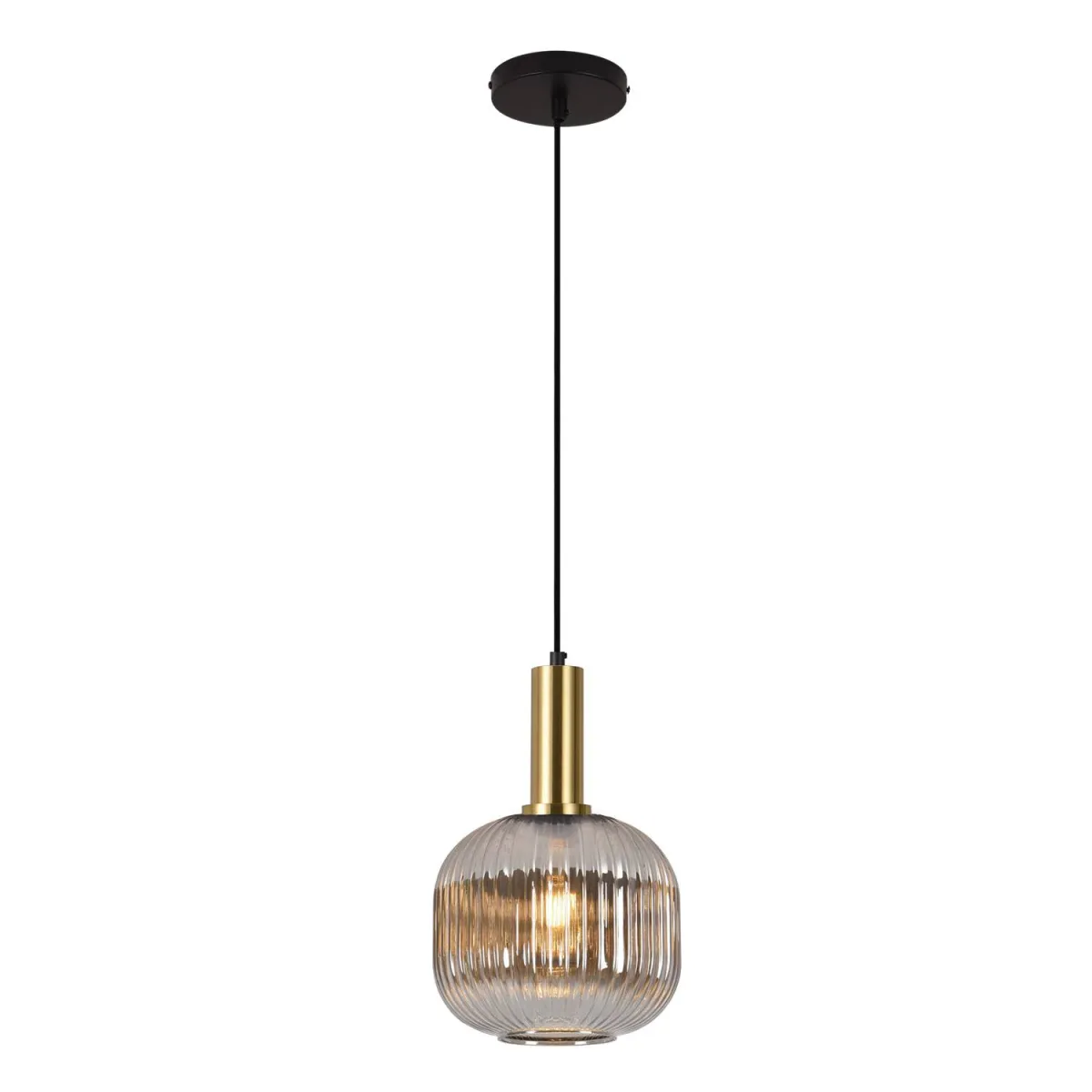 La lampe suspendue Kyle Fumé 1 lumière allie design moderne et élégance, avec une structure en acier peint en or et un abat-jour fumé qui apporte de la chaleur à n'importe quel environnement.