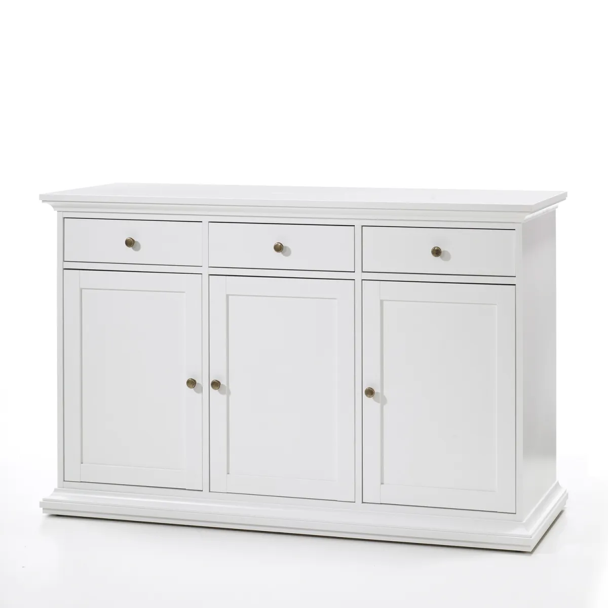 Le Buffet Paris est composé, sur la parti supérieure, de 3 tiroirs avec des poignées métalliques rondes. La partie inférieure, de son côté, dispose de trois portes avec aussi des poignées métalliques rondes, qui vous donneront un grand espace de rangement pour ranger tous vos objets quotidiens.
