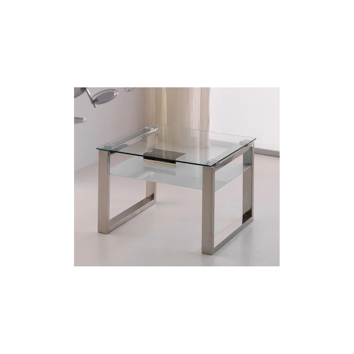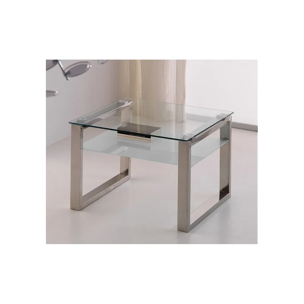 Table basse d'appoint fabriquée en verre trempé transparent et structure en acier poli, avec plateau en verre trempé dépoli à l'acide.