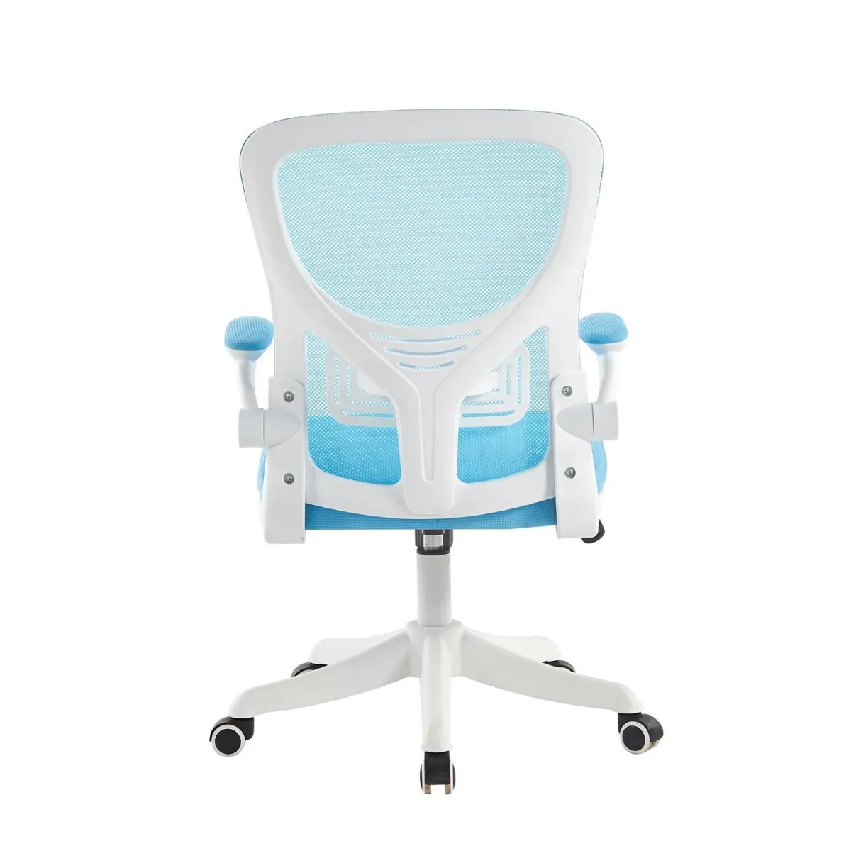 Sedia da scrivania con ruote Studio in bianco e blu, ha un design ergonomico con rinforzo lombare. È una sedia molto compatta e confortevole. Ideale per gli ambienti di studio e di lavoro, sia negli uffici che per l'ufficio di casa o come sedia da studio.