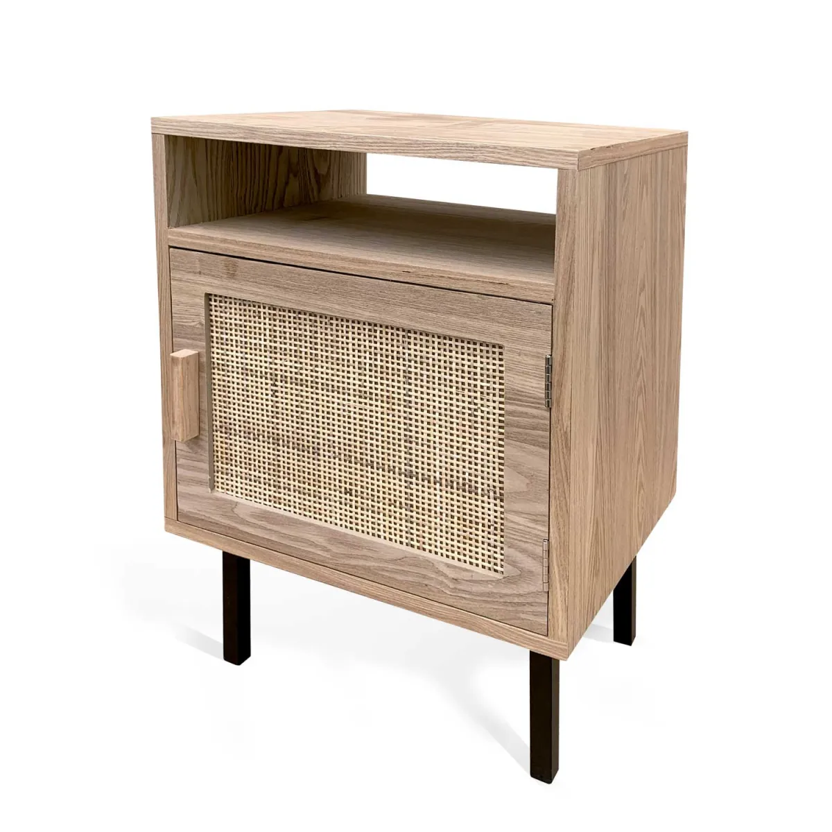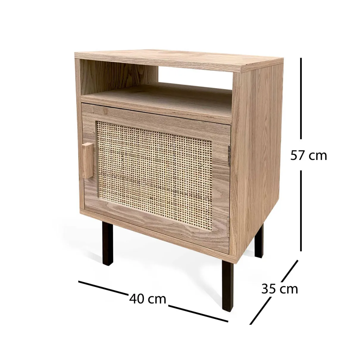 Il nostro mobile TV Tesva combina il calore del suo MDF: impiallacciatura di legno di frassino che conferisce una finitura rustica, ante a traliccio in rattan e le sue gambe in stile industriale in metallo con finitura nera, un mobile che fa tendenza nel mondo della decorazione.