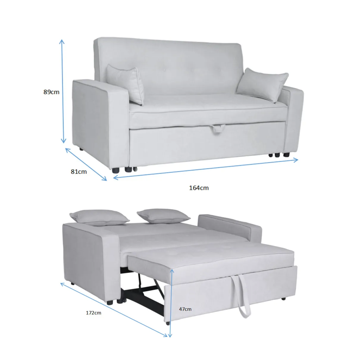 Misure divano: Larghezza 200 cm x Profondità 93 cm x Altezza 86 cm. Misure letto: Larghezza 175 cm x Profondità 108 cm x Altezza 43 cm.
