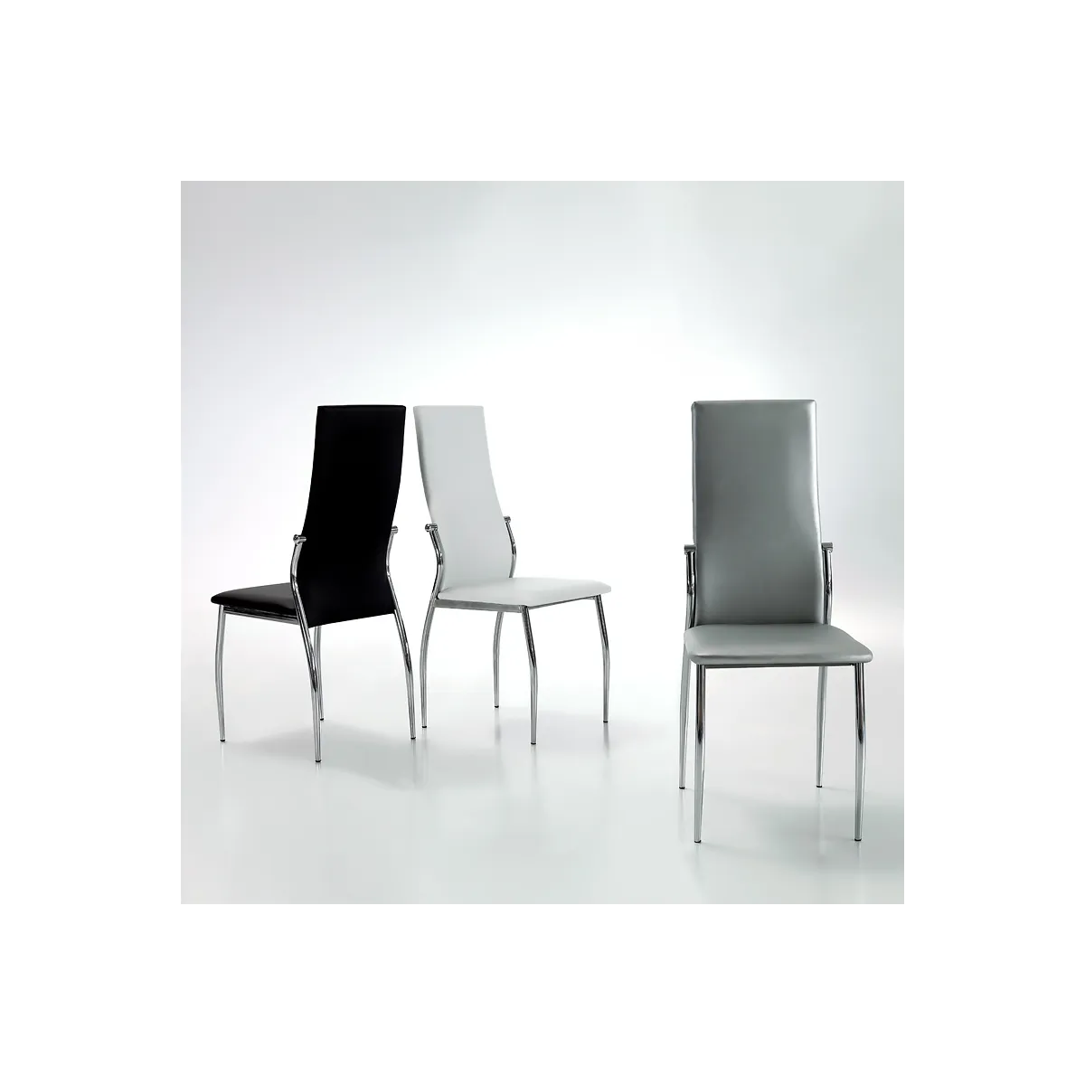 Sedia imbottita fabbricata in similpelle, in Pu, ovvero un poliuretano ad alta resistenza con una trama morbida e flessibile, che lo rende ideale per un uso prolungato nel tempo, ottenendo al tatto e alla vista un prodotto simile alla vera pelle ma ad un costo consistentemente più basso. Con gambe in acciaio cromato