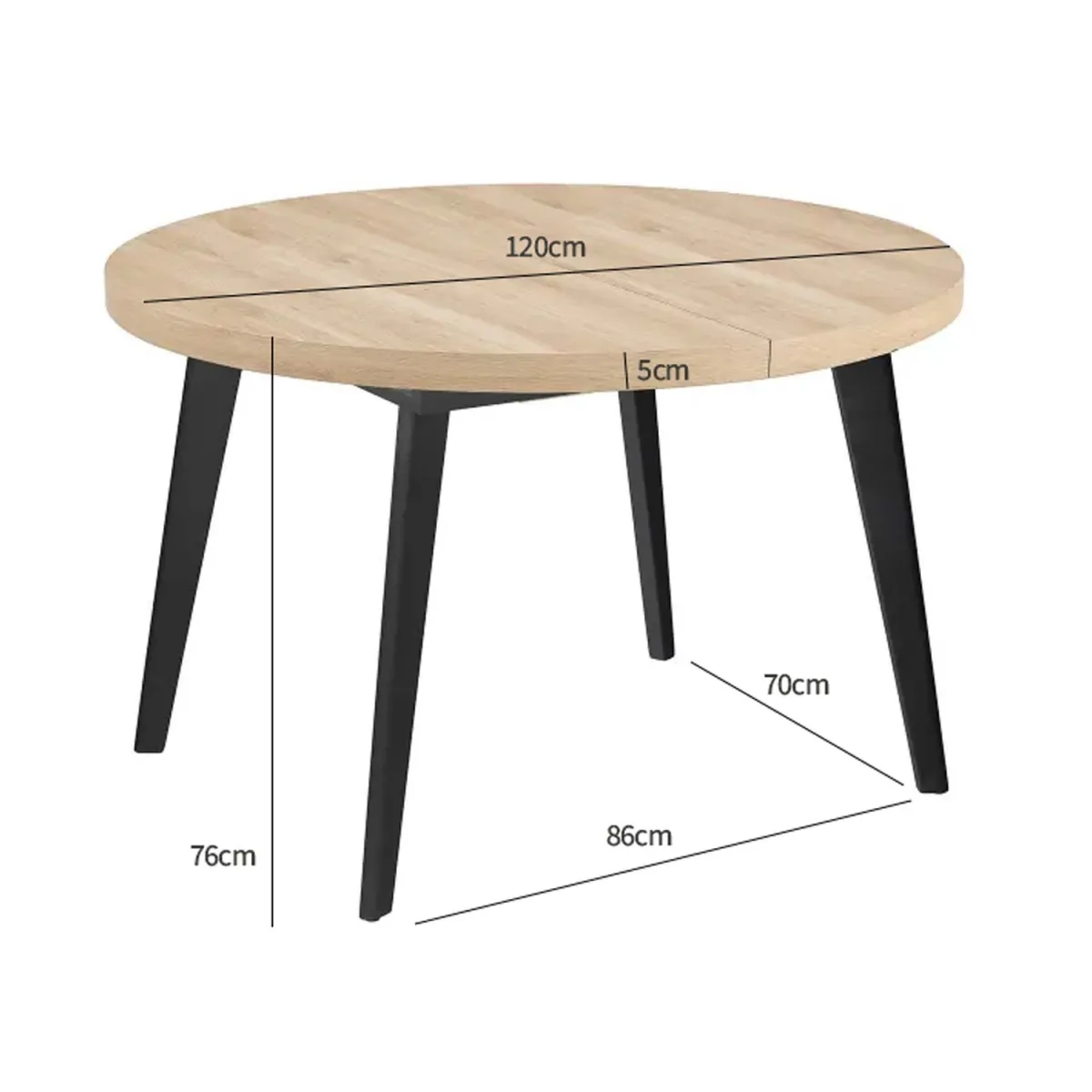 Dona carattere alla tua zona pranzo con il Tavolo Luna, un tavolo rotondo allungabile con pannello di fibra a media densità effetto legno e gambe metalliche bianche. Design moderno e pratico.