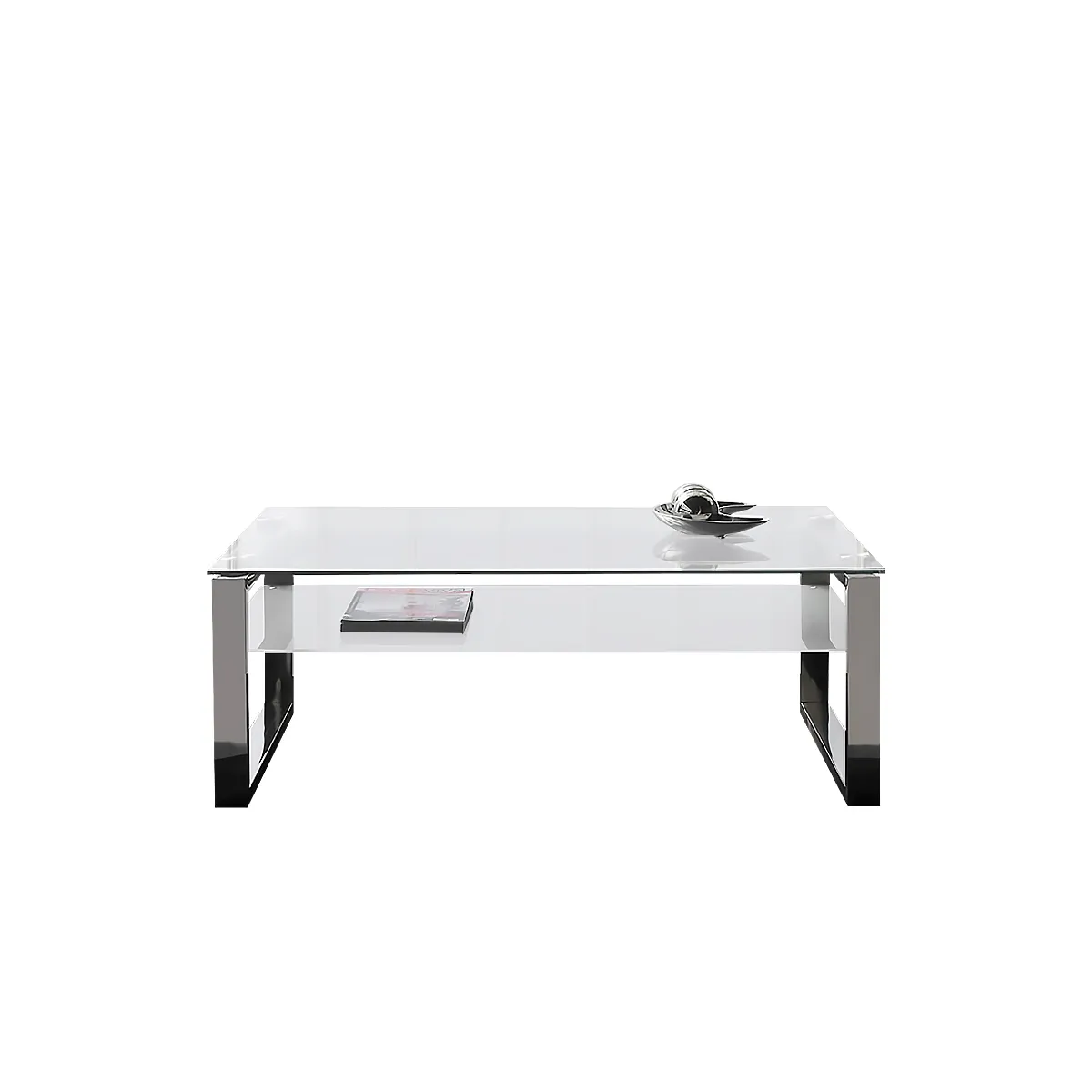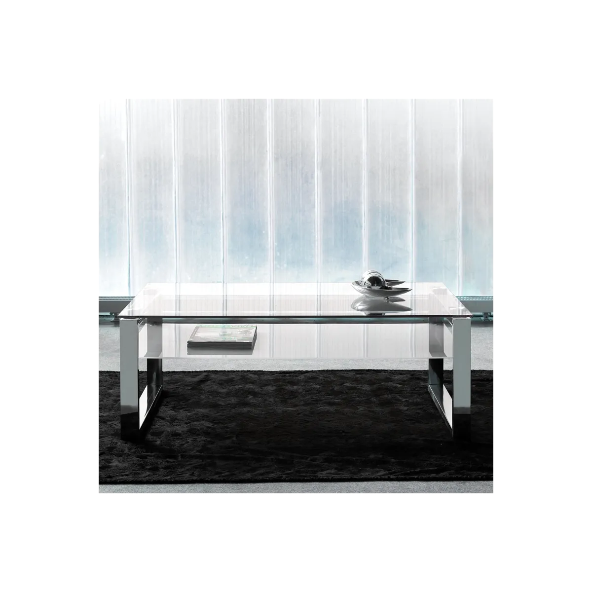 Mesa de centro auxiliar de design minimalista, fabricada em vidro temperado transparente com prateleira inferior para revistas ou objetos decorativos.