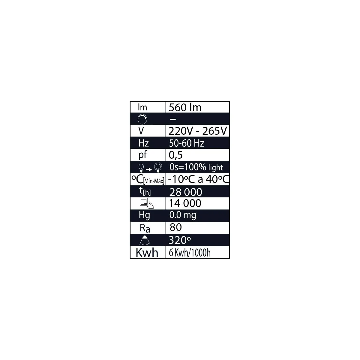 Lâmpada LED decorativa E27 · 6W · 560 lm · 2300K para criar um ambiente de luz quente e destacar a decoração.Potência: 6WFluxo luminoso: 560 lmTemperatura de cor: 2300K (luz quente)Vida útil: 28 000 hMedidas: Ø 9,5 cm · A 13,5 cm