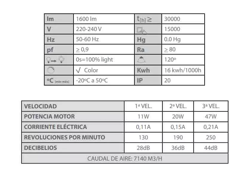 Ventilador de teto com 3 velocidades, corpo em Alumínio com acabamento branco e 4 pás em madeira branca. Inclui 1 casquilho E27 com tulipa de cristal onde pode montar uma lâmpada LED ou incandescente até 40W. O ventilador dispõe de 2 correntes, uma delas para ligar e desligar a luz do ventilador e a outra para alternar entre as 3 velocidades que possui....