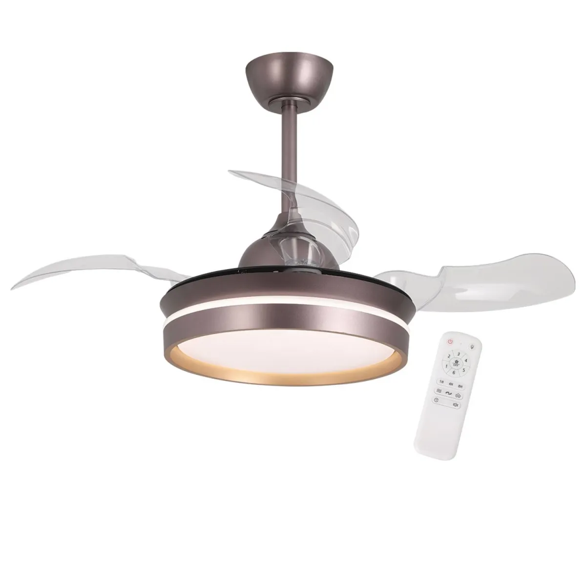 O ventilador LED de 4 lâminas plegáveis Bakar garante um fluxo de ar poderoso com um design elegante e funcional. Com um motor silencioso de corrente contínua (DC), oferece 6 velocidades ajustáveis para atender às suas necessidades. Inclui comando remoto, iluminação LED regulável em cor e intensidade, e duas opções de altura para uma instalação flexível....