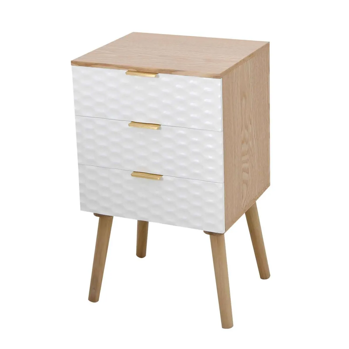 Mesa de cabeceira Sweet 3 gavetas com guias metálicas deslizantes e alças em forma de bola em branco, é feita de melamina de alta qualidade na cor branco Artik com pernas ABS na cor clara.