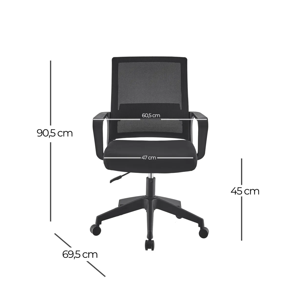 Cadeira de secretária Felicity estofada em cinzento escuro com apoios de braços e altura ajustável com cinco rodízios para que se possa mover rapidamente em torno da área de trabalho. Assento almofadado, encosto e apoios de braços para maior conforto.