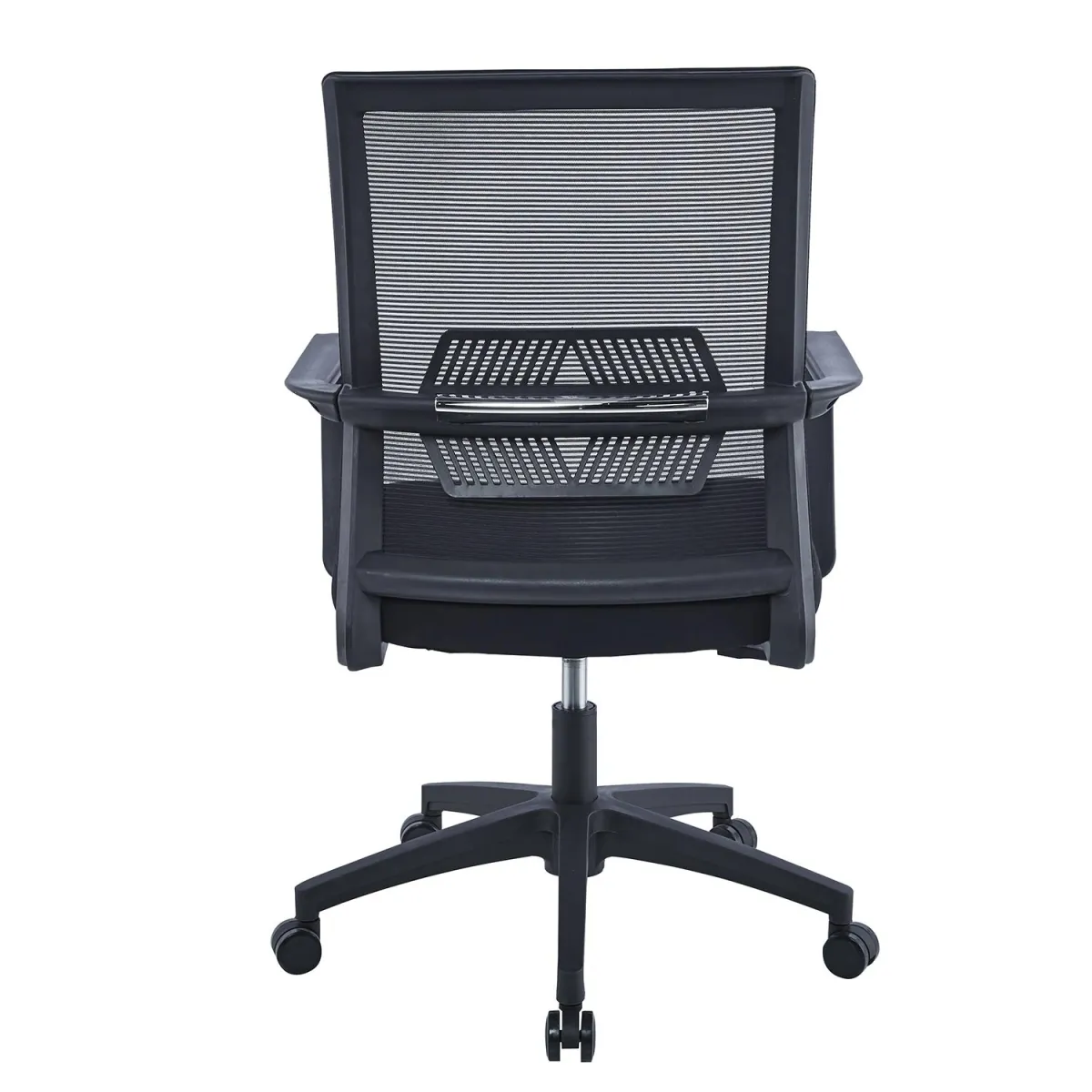 Cadeira de secretária Felicity estofada em cinzento escuro com apoios de braços e altura ajustável com cinco rodízios para que se possa mover rapidamente em torno da área de trabalho. Assento almofadado, encosto e apoios de braços para maior conforto.