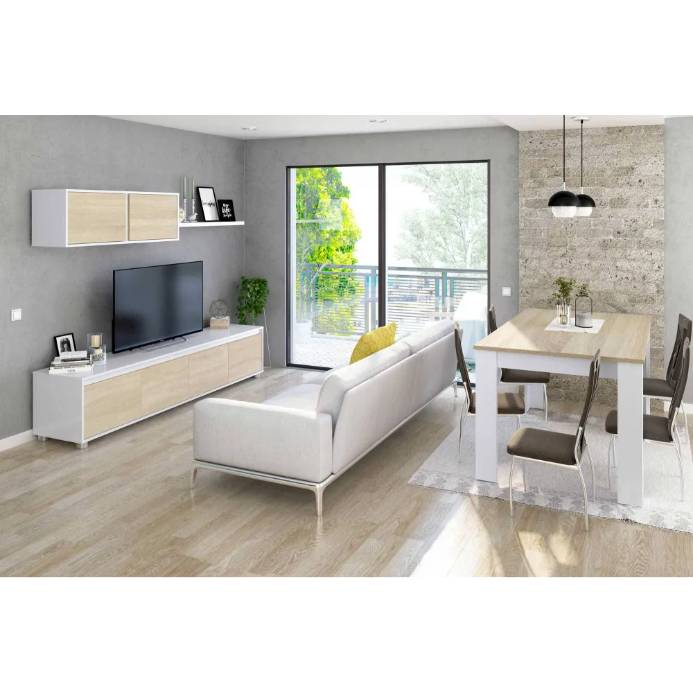 Composição da sala de TV com 200 cm de largura e 41 cm de profundidade, composta por um módulo baixo com quatro portas, um módulo alto com duas portas e uma prateleira com acabamento em melamina de alta resistência de 19 e 15 mm em branco Artik liso fosco e carvalho canadense.